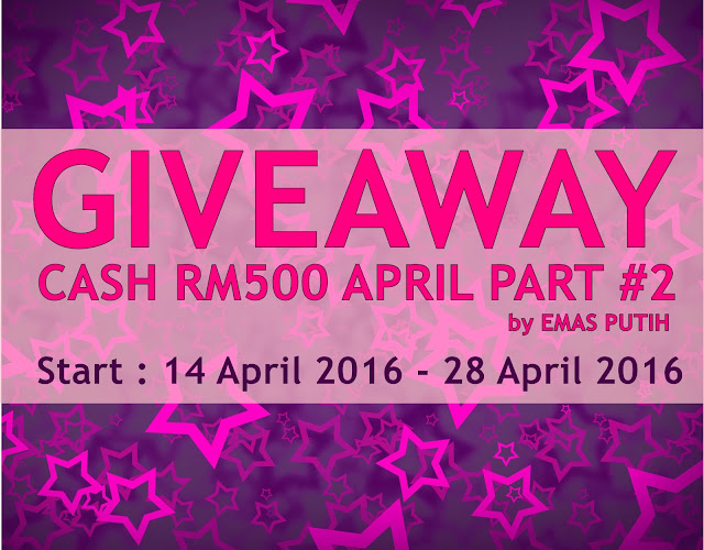 Giveaway Cash RM500 APRIL PART #2 by Emas Putih disponser oleh Emas Putih , Nurfuzie , Boni Kacak , Fizgraphic , Asri Blog , Liyana , RF3 World Firmax3 Malaysia , Homestay Muslim Murah di Bandar Melaka , Norfa Nil , Salina Johari , MrsPuex , Pakej Ke Korea , Siti Yang Menaip .